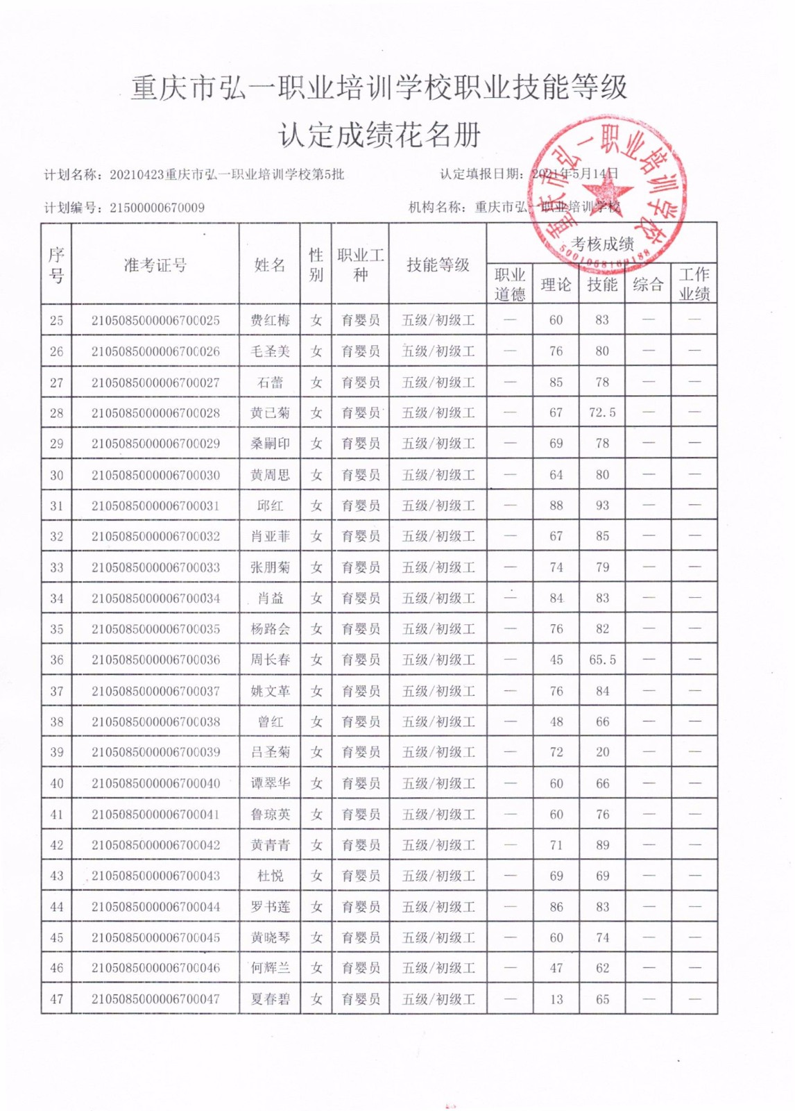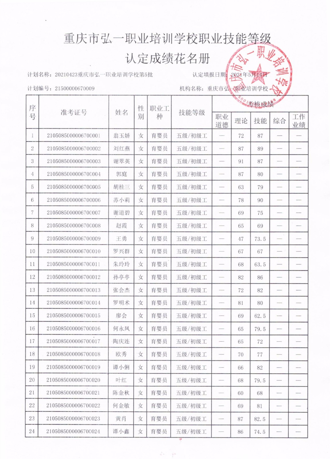 弘一职校 重庆市弘一职业培训学校职业技能等级认定成绩花名册