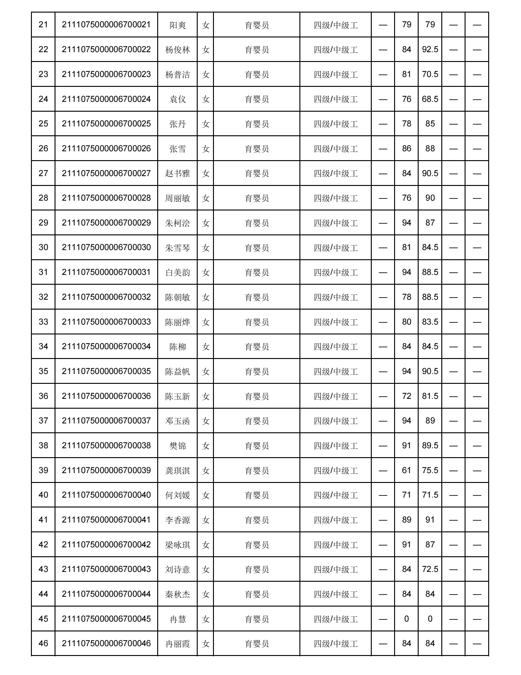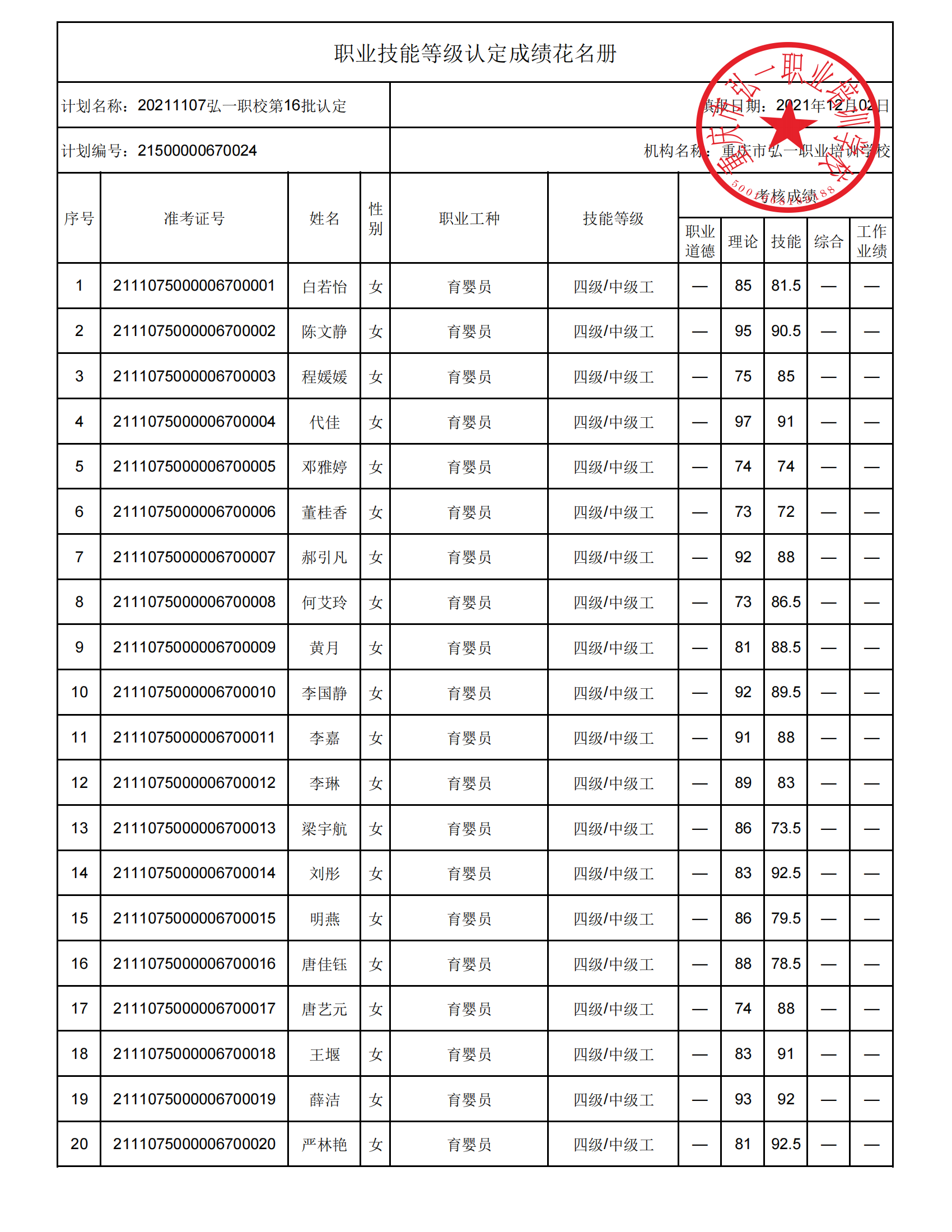 根据《重庆市职业技能等级认定操作指南(试行)》文件精神,现将20211107弘一职校第16批职业技能认定育婴员四级考试成绩予以公示,如有疑问,请联系曾老师:18008386673